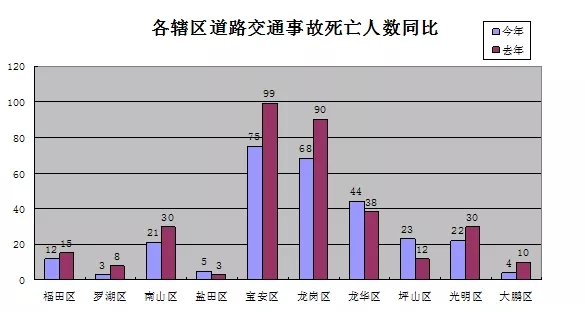 今年以來(lái),在全市各行政區(qū)(新區(qū))中,實(shí)現(xiàn)道路交通事故死亡人數(shù)下降的有7個(gè)區(qū)。其中寶安區(qū)事故死亡人數(shù)減少24人,龍崗區(qū)事故死亡人數(shù)減少22人,這兩個(gè)我市傳統(tǒng)的事故多發(fā)區(qū)事故死亡人數(shù)下降數(shù)占全市事故死亡人數(shù)下降總?cè)藬?shù)的79.31%。