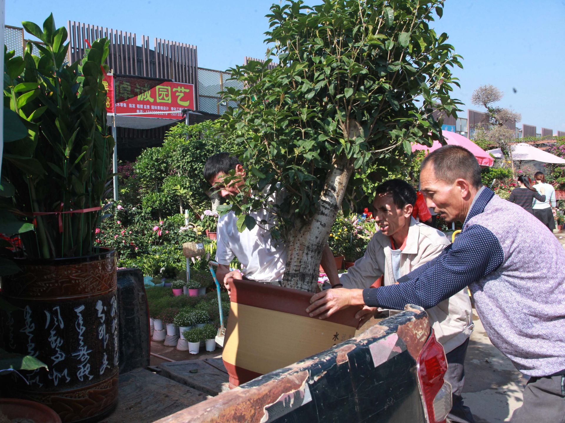 當天的龍崗東部花卉世界,到處花團錦簇,一盆盆顏色各異的年花喜迎初春,整個市場充滿了春天蓬勃的氣息?;ㄞr(nóng)們正忙著搬運、擺放盆栽,不時有市民前來問詢,花卉運輸一輛接一輛車,絡繹不絕,往來的客商頻頻詢問價格,已經(jīng)搶占先機的客商興高采烈地精心挑選,包裝搬運……