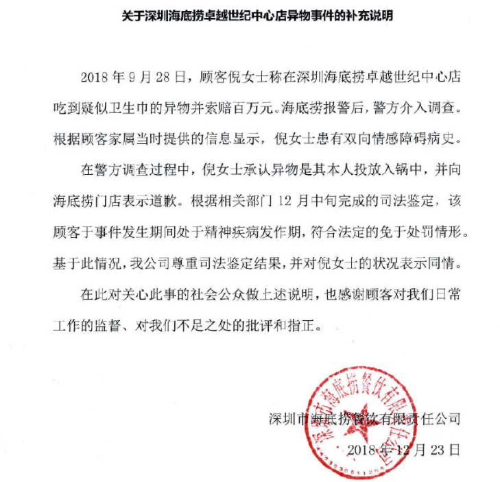 大伙兒還記得深圳海底撈福田卓越店被曝火鍋有衛(wèi)生巾的事兒?jiǎn)幔?/p>