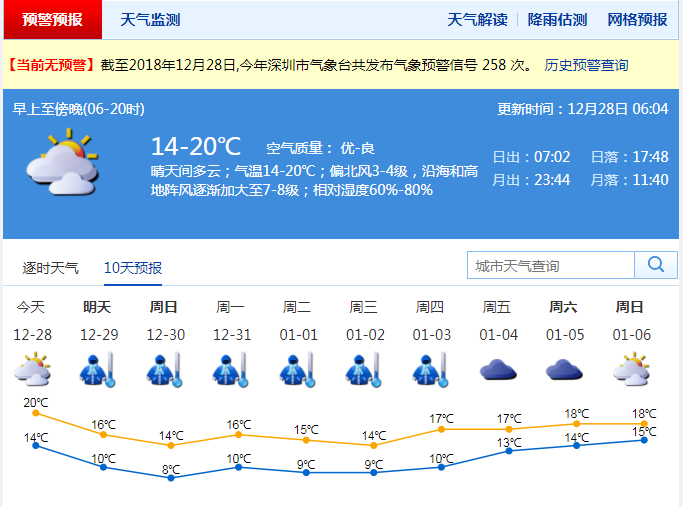 深圳市氣象局預(yù)計,12月28日受冷空氣前鋒影響,我市多云間晴天,風力加大,沿海和高地最大陣風7-8級,氣溫下降,早晚清涼;29日-元月2日受冷空氣主體影響,氣溫顯著下降,天氣持續(xù)寒冷,最低氣溫在8℃左右,伴有7-9級陣風,間中有小雨。寒冷天氣將持續(xù)5-6天。