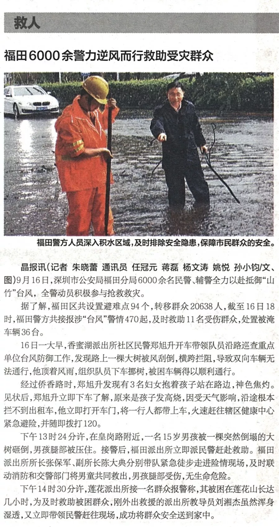 ★★福田警方啟動(dòng)一級(jí)勤務(wù),全力投入防御超強(qiáng)臺(tái)風(fēng)“山竹”行動(dòng)中。福田警方共接報(bào)涉“臺(tái)風(fēng)”警情470起,及時(shí)救助11名受傷群眾,轉(zhuǎn)移群眾20638人,處置被淹車輛36臺(tái),確保了轄區(qū)治安穩(wěn)定。
