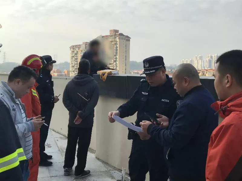 隨后,公安、消防等多部門很快趕到現(xiàn)場。大家兵分幾路,一路是消防救援人員,立即在一樓鋪設了救援氣墊,另一路是民警,對男子進行現(xiàn)場勸說。