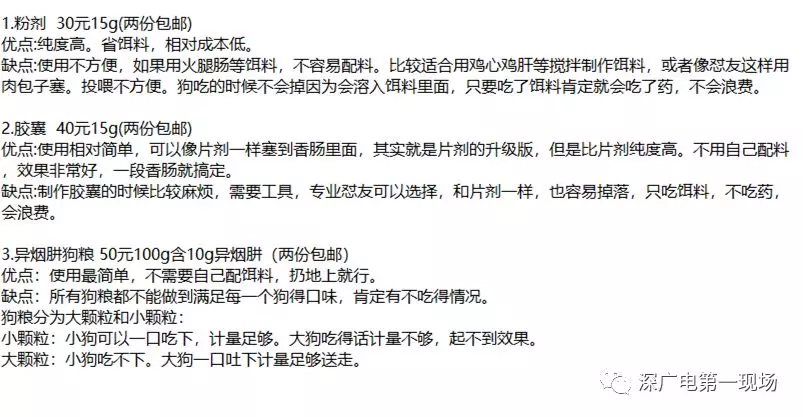 今天上午,記者通過搜索,找到了一名專門售賣異煙肼的網(wǎng)友,對方給出了粉劑、膠囊、異煙肼狗糧三種套餐,每種套餐中還特地標明了針對寵物狗的配料優(yōu)缺點,并且直接將寵物狗吃下后的效果也標明在其中。
