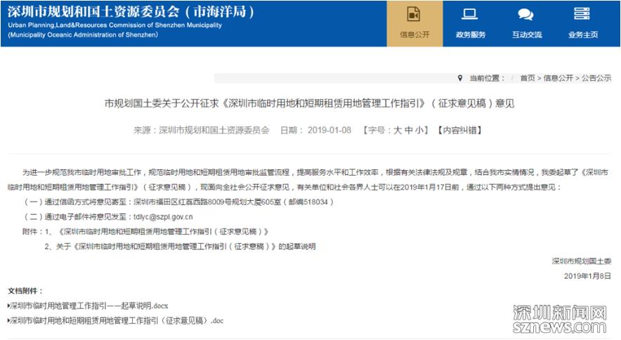 深圳新聞網(wǎng)2019年1月8日訊(記者 潘潤華)1月8日,市規(guī)土委起草發(fā)布《深圳市臨時用地和短期租賃用地管理工作指引(征求意見稿)》(以下簡稱“征求意見”)。根據(jù)該征求意見,社會投資主體組織實施的急需公共服務(wù)設(shè)施用地為短期租賃用地,需按照我市地價測算相關(guān)規(guī)則繳交租金。