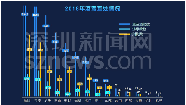 在發(fā)布會上,深圳交警偵查大隊(duì)三中隊(duì)副中隊(duì)長馬于兵重點(diǎn)分析了酒駕查處的區(qū)域分布情況。統(tǒng)計(jì)顯示,龍崗區(qū)以1670的酒駕查處量位列第一,寶安區(qū)、龍華區(qū)緊隨其后。