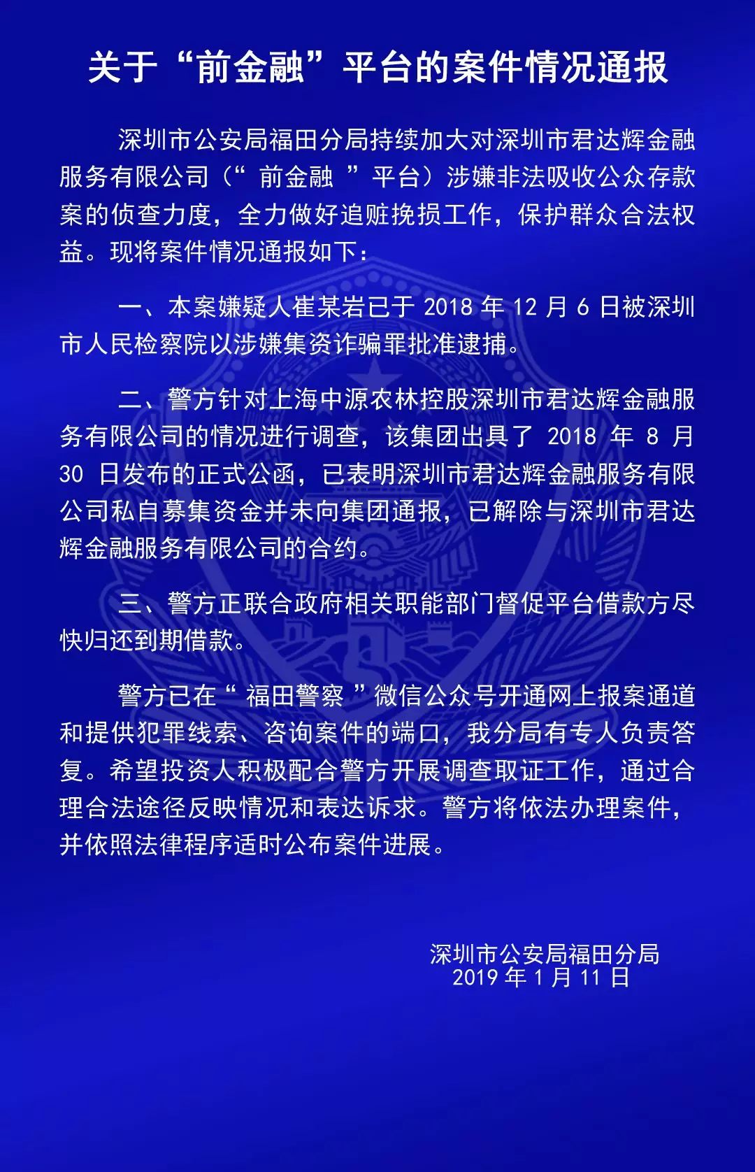 福田公安通報六家平臺涉嫌非法吸收公眾存款案的情況