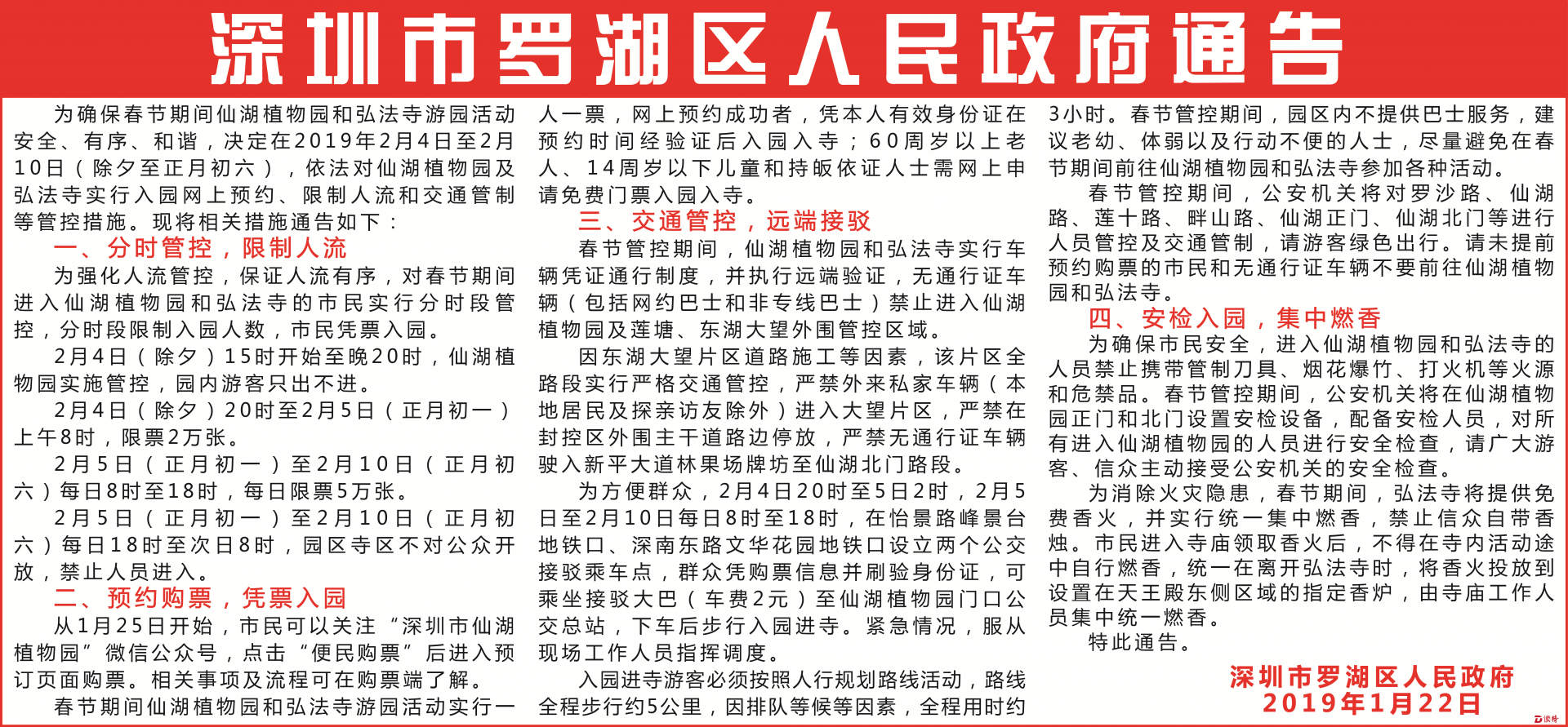 為確保春節(jié)期間仙湖植物園和弘法寺游園活動安全、有序、和諧,決定在2019年2月4日至2月10日(除夕至正月初六),依法對仙湖植物園及弘法寺實行入園網(wǎng)上預(yù)約、限制人流和交通管制等管控措施?,F(xiàn)將相關(guān)措施通告如下: