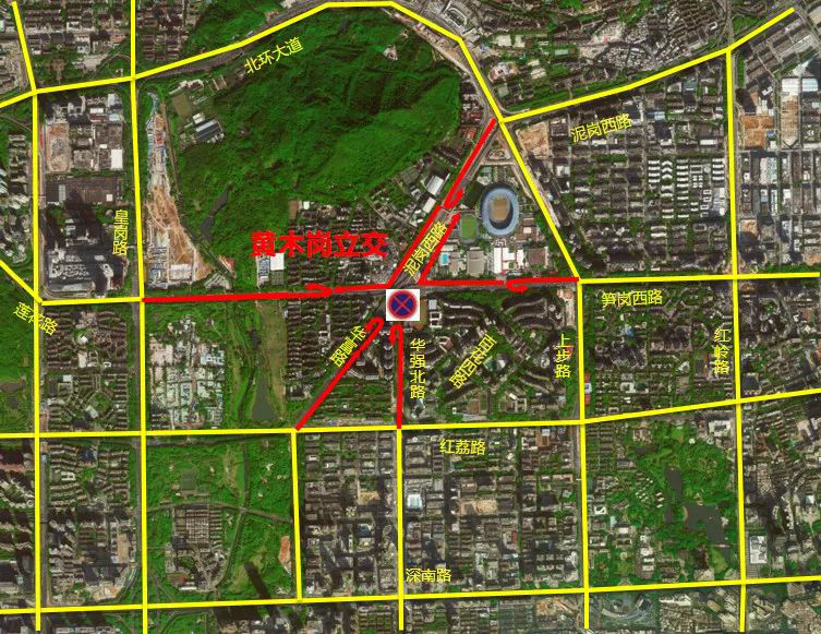 原經(jīng)黃木崗立交節(jié)點的交通需從北環(huán)大道、紅荔路、深南大道、彩田路、皇崗路、上步路、紅嶺路等外圍道路繞行。