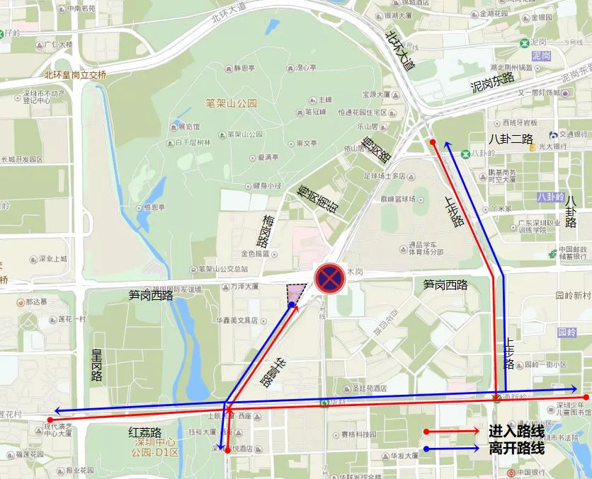 原經(jīng)華富路北行往醫(yī)院交通調(diào)整為:皇崗路 -筍崗西路 -梅崗路 -梅崗南街上步路 -泥崗西路。