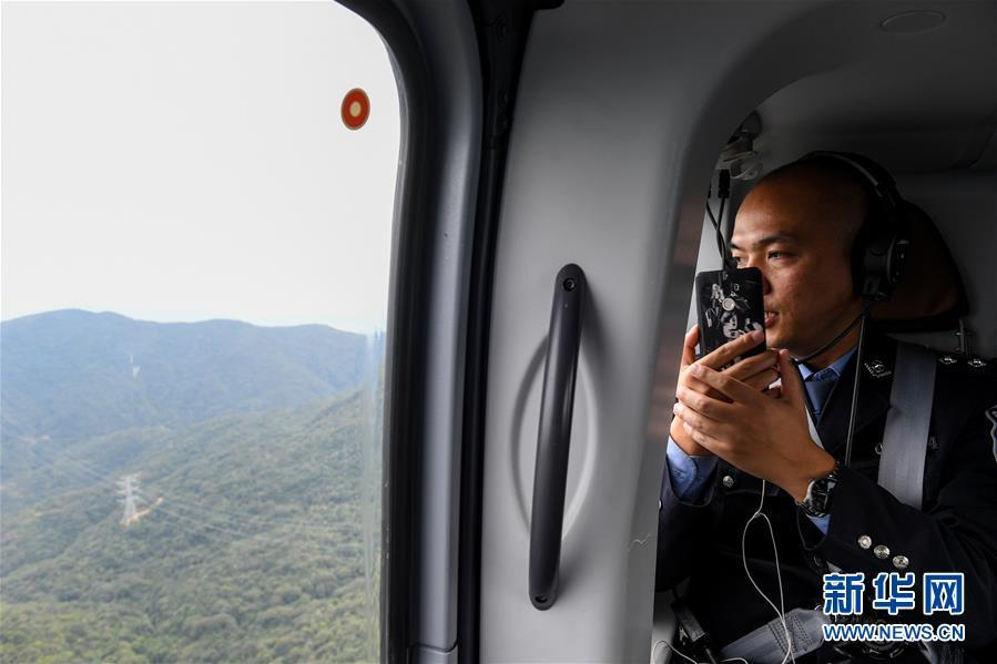 2月1日,深圳市公安局交通警察局指揮處民警劉松超在直升機上了解路面情況。2019年春運,深圳市公安局交通警察局開啟陸空立體探路模式,首次啟用直升機探路。據介紹,此次直升機探路將開展5次,屆時交警選取代表性線路從空中探察路面情況,及時為司機提供立體交通通行指引。新華社記者 毛思倩 攝