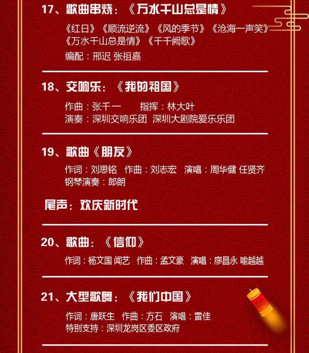 這場晚會的作品原創(chuàng)味十足。在20多個節(jié)目中,相當一部分音樂作品來自深圳本土原創(chuàng),開場的《城市歡樂頌》、譚維維演唱的《南方有座山》、陳思思演唱的《南國花兒艷》、廖昌永/喻越越演唱的《信仰》、雷佳演唱的《我們中國》等等,這些原創(chuàng)歌曲集中展現(xiàn)了深圳30多年來在音樂創(chuàng)作上的成果。