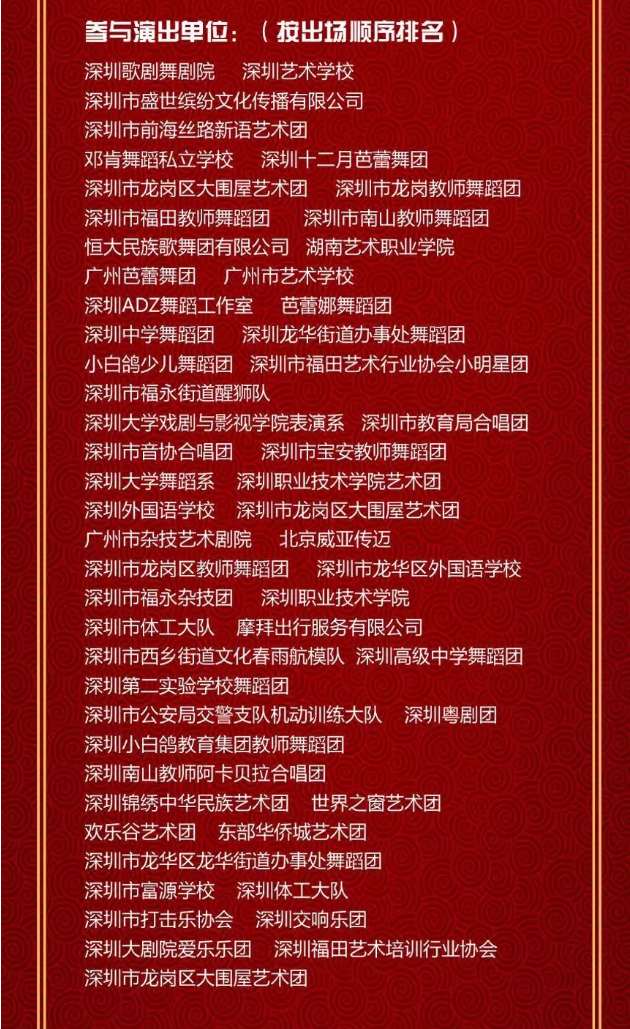 深圳春晚由央視主持人李思思、深圳衛(wèi)視主持人龐瑋、楚喬和香港著名主持人陳啟泰共同主持。晚會節(jié)目內(nèi)容豐富、表現(xiàn)形式多樣,有歌舞、歌曲、交響樂,還有多媒體互動相聲。演員陣容強大,邀請了張靚穎、廖昌永、郎朗、周華健、汪明荃、任賢齊、譚維維等多位明星參演,力爭為全國觀眾送上一道豐盛又精彩的年夜“大餐”。