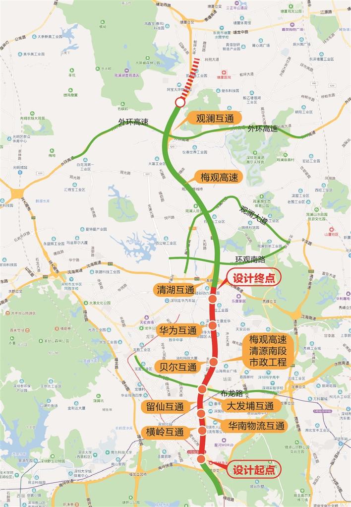 梅觀高速開通于1995年,途經(jīng)龍華區(qū)的民治街道、龍華街道和龍崗區(qū)的坂田街道等地,與莞深高速相連接。2014年,該高速路梅林至觀瀾段取消收費,這是全國首條運營期內(nèi)通過政府回購方式取消收費的高速公路。由于免費后的梅觀高速車流量急劇增加,交通擁堵日益嚴重。而且,隨著深圳經(jīng)濟社會的發(fā)展、龍華區(qū)的正式掛牌成立,梅觀高速沿線區(qū)域與城市的發(fā)展背景也發(fā)生了較大的變化,作為支撐沿線龍華區(qū)和龍崗坂田片區(qū)兩大功能區(qū)發(fā)展的關(guān)鍵性交通走廊地位愈發(fā)突出,原有的道路不能滿足城市發(fā)展的需要。