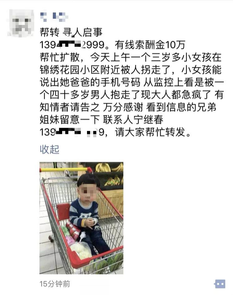 深圳晚報(bào)2019年2月13日訊 2月10日晚間一則內(nèi)容為"家長(zhǎng)懸賞10萬(wàn)元尋找3歲被拐女孩"的消息,刷爆了很多網(wǎng)友的微信朋友圈。"幫忙擴(kuò)散,3歲女孩在錦繡花園小區(qū)被拐走,家長(zhǎng)拿出10萬(wàn)元酬金尋人……"網(wǎng)友紛紛傳遞愛(ài)心的同時(shí),也在為女孩的安危捏著一把汗。然而,記者調(diào)查發(fā)現(xiàn)實(shí)際情況卻并非如此......