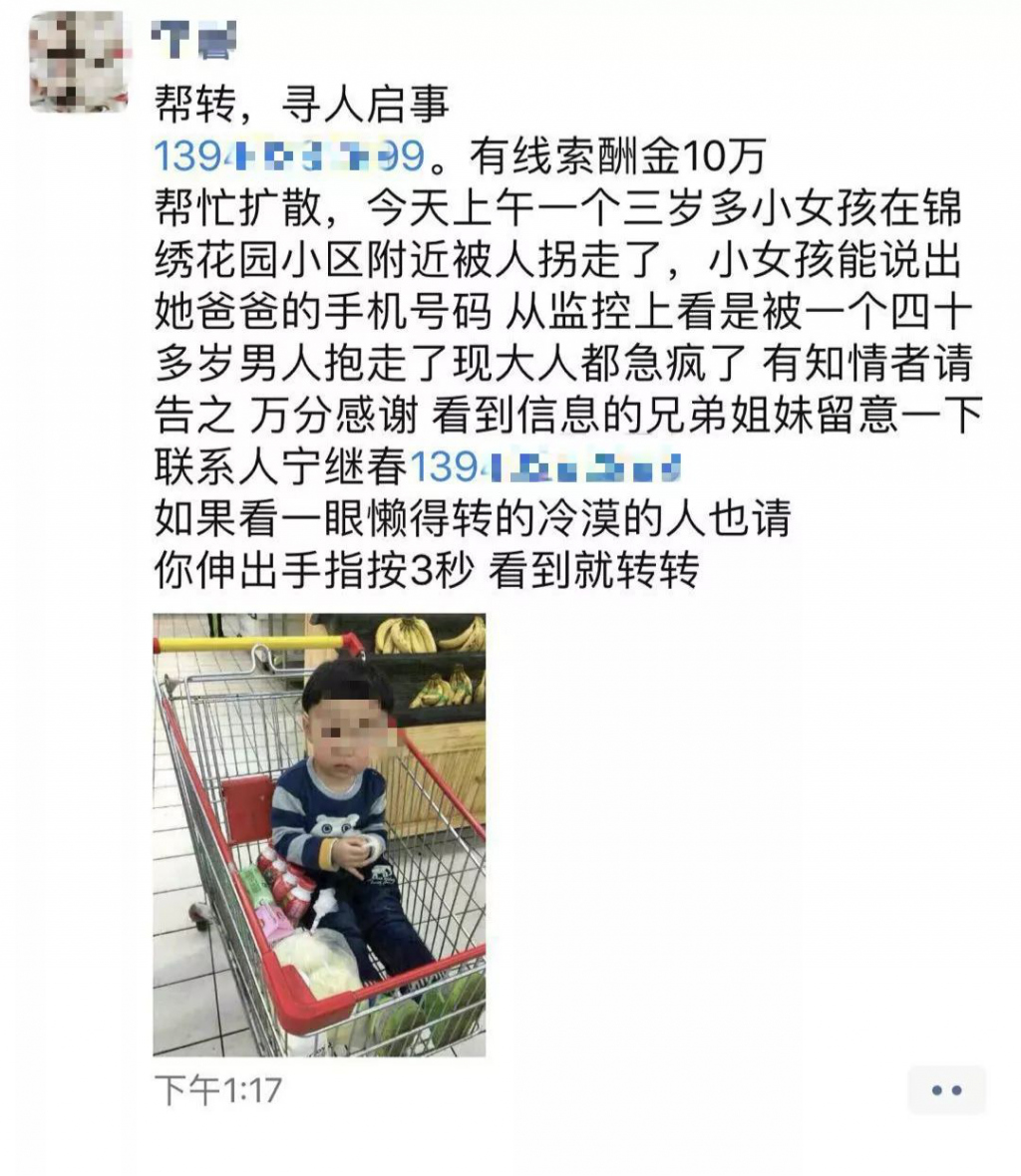 2月10日晚間,不少人的微信朋友圈被一條尋人消息刷屏。消息稱,一名3歲女孩在錦繡花園小區(qū)附近被人拐走,小女孩能說(shuō)出她爸爸的手機(jī)號(hào)碼。從監(jiān)控上看,她是被一名40多歲的男人抱走了。