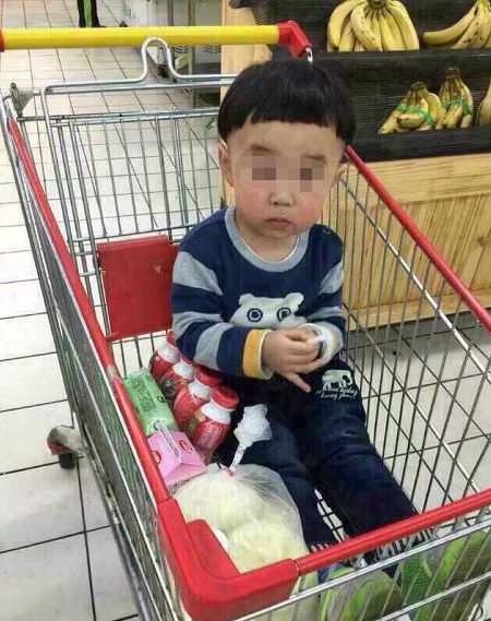 消息配發(fā)的圖片顯示,一名年幼的兒童坐在超市的購物車?yán)铮荒樚煺鏍€漫的模樣。圖片中的兒童指稱是被拐的女孩。