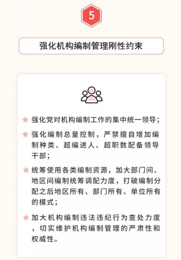 五是全面落實優(yōu)化協(xié)同高效原則。堅持一件事情原則上由一個部門負責,把理順職責放在重要位置,從有利于突出主業(yè)、有利于服務(wù)管理的角度出發(fā),實事求是,科學設(shè)置黨委和政府機構(gòu),宜大則大、宜小則小,該加強的加強、該精簡的精簡、該優(yōu)化的優(yōu)化,實現(xiàn)機構(gòu)職責的深度融合。