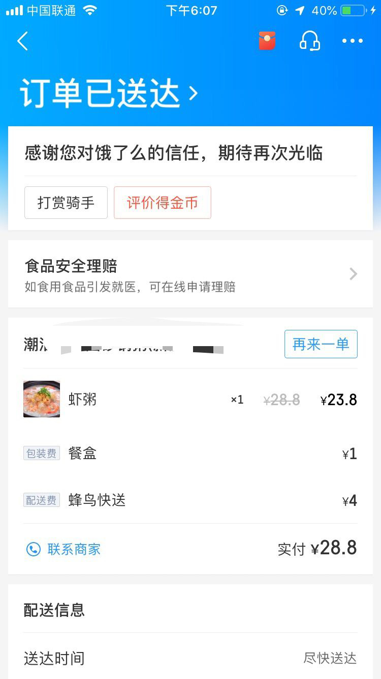 2月12日上午10點多,市民黃先生在餓了么外賣平臺點了一份潮汕砂鍋粥。2個小時后,肚子快餓癟的黃先生等到了外賣小哥的電話。外賣小哥告訴他,外賣在電動車上被偷了,對此很抱歉,麻煩黃先生重新點餐,并希望添加他的微信進行賠償。