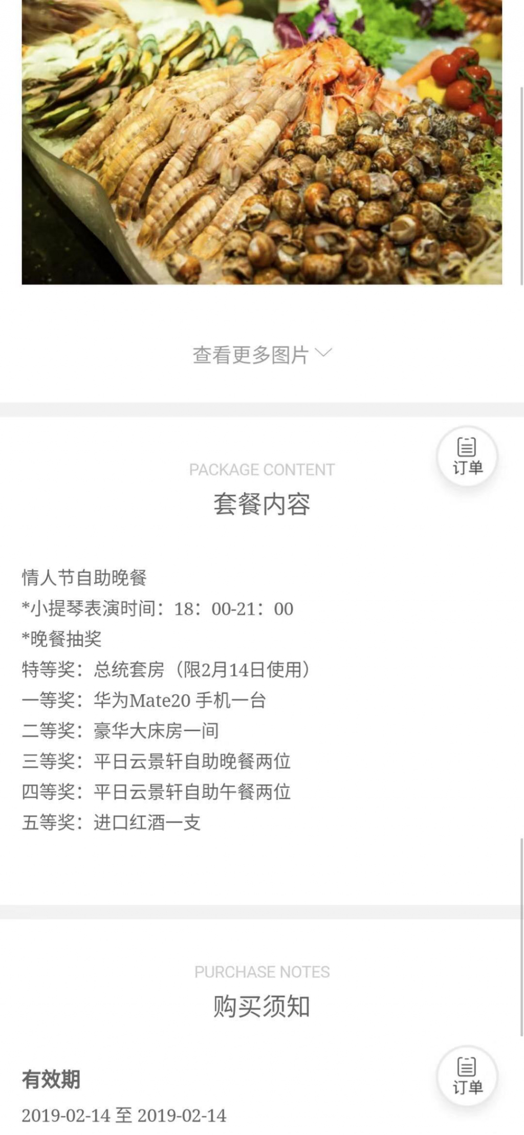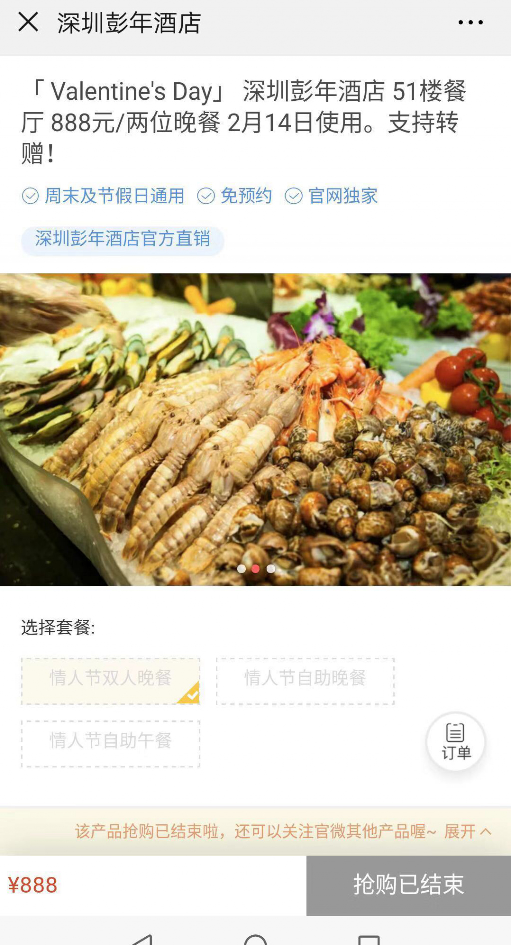 梅先生家住羅湖區(qū),2月14日情人節(jié)將至,他打算和女朋友找一個(gè)有節(jié)日氣氛的地方共進(jìn)晚餐。2月13日,梅先生在深圳彭年酒店的微信公眾號(hào)上搶購(gòu)了一個(gè)888元情人節(jié)雙人晚餐,并支付了所有費(fèi)用。據(jù)了解,該情人節(jié)雙人晚餐是該酒店推出的"Valentine’ s Day"51樓餐廳888元 /兩位晚餐,套餐內(nèi)容包含情人節(jié)自助晚餐、小提琴表演、晚餐抽獎(jiǎng),其中特等獎(jiǎng)為總統(tǒng)套房(限2月14日使用),還有一至五等獎(jiǎng)5個(gè)獎(jiǎng)項(xiàng)。