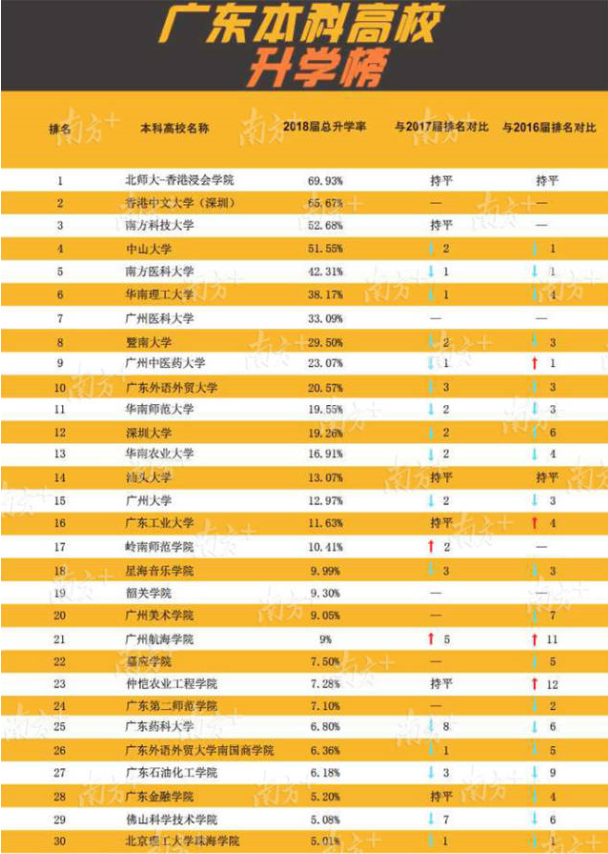 在發(fā)布“薪酬榜”后(點擊查看“薪酬榜”),今天南方教育智庫繼續(xù)獨家推出廣東高?!吧龑W(xué)榜”,梳理全省123所高校發(fā)布的《2018年畢業(yè)生就業(yè)質(zhì)量年度報告》的關(guān)鍵數(shù)據(jù),聚焦畢業(yè)生的深造路徑和升學(xué)比例。其中南方醫(yī)科大學(xué)、中山大學(xué)、廣州醫(yī)科大學(xué)本科畢業(yè)生國內(nèi)升學(xué)率位列前3名,均超過33%。