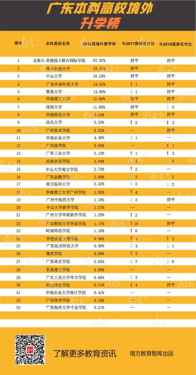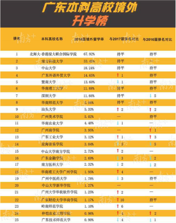廣東外語外貿(mào)大學(xué)境外留學(xué)人數(shù)顯著提升,2018屆共有275人升入世界排名前100名的高校深造。兩所內(nèi)地與香港合作創(chuàng)辦的大學(xué)在境外留學(xué)率上處于全省前列。北京師范大學(xué)-香港浸會大學(xué)聯(lián)合國際學(xué)院持續(xù)多年保持全省第1位,此次共有811人留學(xué),其中481人就讀世界前100名的大學(xué)。香港中文大學(xué)(深圳)僅公布總升學(xué)率65.67%,該校就業(yè)處相關(guān)負(fù)責(zé)人介紹,升學(xué)率中絕大部分是境外留學(xué),176名學(xué)生平均每人收到3份世界知名大學(xué)錄取通知書。