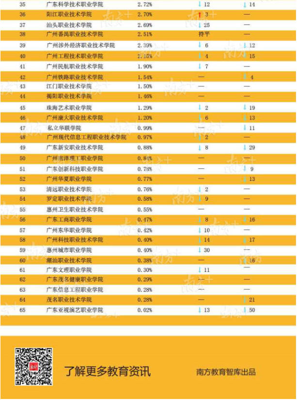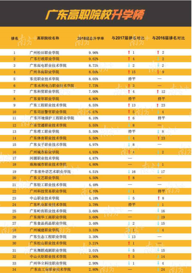 近3年各高職升學(xué)數(shù)據(jù)顯示,越來越多畢業(yè)生通過升學(xué)提升自身競爭力,尤其2018屆升學(xué)率增長明顯。其中有7所高職院校的畢業(yè)生升學(xué)率達(dá)到或超過7%,分別是廣州松田職業(yè)學(xué)院9.96%、廣東行政職業(yè)學(xué)院9.62%、廣東郵電職業(yè)技術(shù)學(xué)院8.73%、廣州華商職業(yè)學(xué)院8.06%、東莞職業(yè)技術(shù)學(xué)院8.05%、廣東水利電力職業(yè)技術(shù)學(xué)院7.73%和廣東科貿(mào)職業(yè)學(xué)院7.00%。