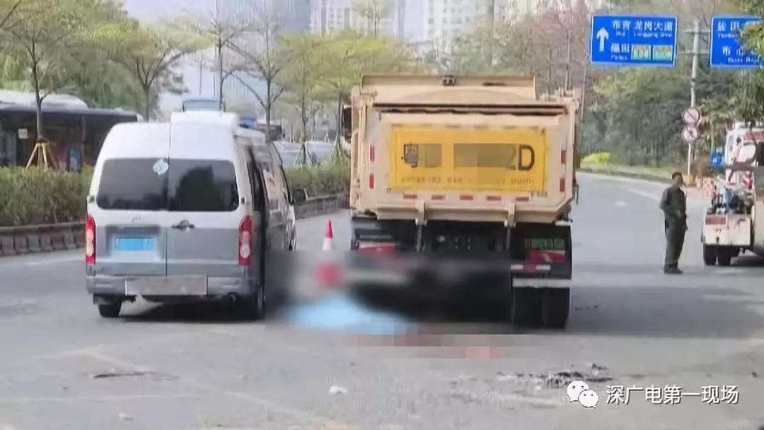 下午3點(diǎn)左右,第一現(xiàn)場記者趕到事發(fā)現(xiàn)場,文錦北路與水貝二路交界處的路口。肇事泥頭車車頭朝北停在路邊,左后輪下方及后面一片血肉模糊,遇難者的遺體還被壓在下方。