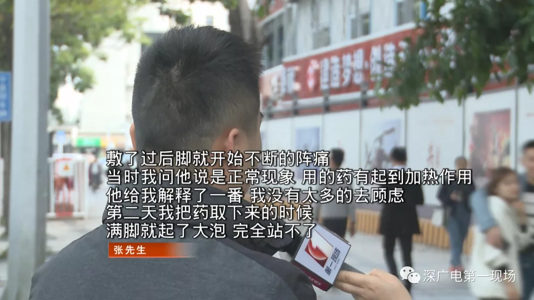張先生曾跟簡某討說法,要他退500塊藥費,簡某說退錢是不可能的,而且張先生的水泡,他就能處理。但張先生已經(jīng)不敢相信簡某。
