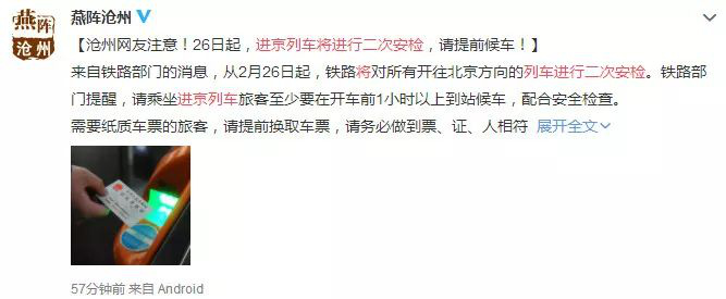 從2月26日起,鐵路將對(duì)所有開往北京方向的列車進(jìn)行二次安檢,即旅客在車站各進(jìn)站口安檢后還需要前往固定區(qū)域再進(jìn)行一次安檢。