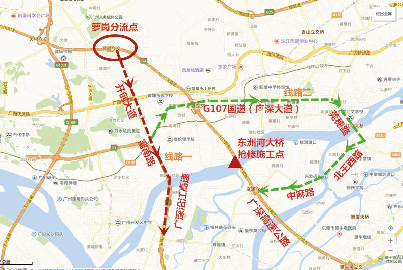 (2)廣深高速公路深圳方向蘿崗出口→開(kāi)創(chuàng)大道→ G107國(guó)道(廣深大道)→莞穗路→北王西路→中麻路→廣深高速公路麻涌站入口→東莞、深圳。