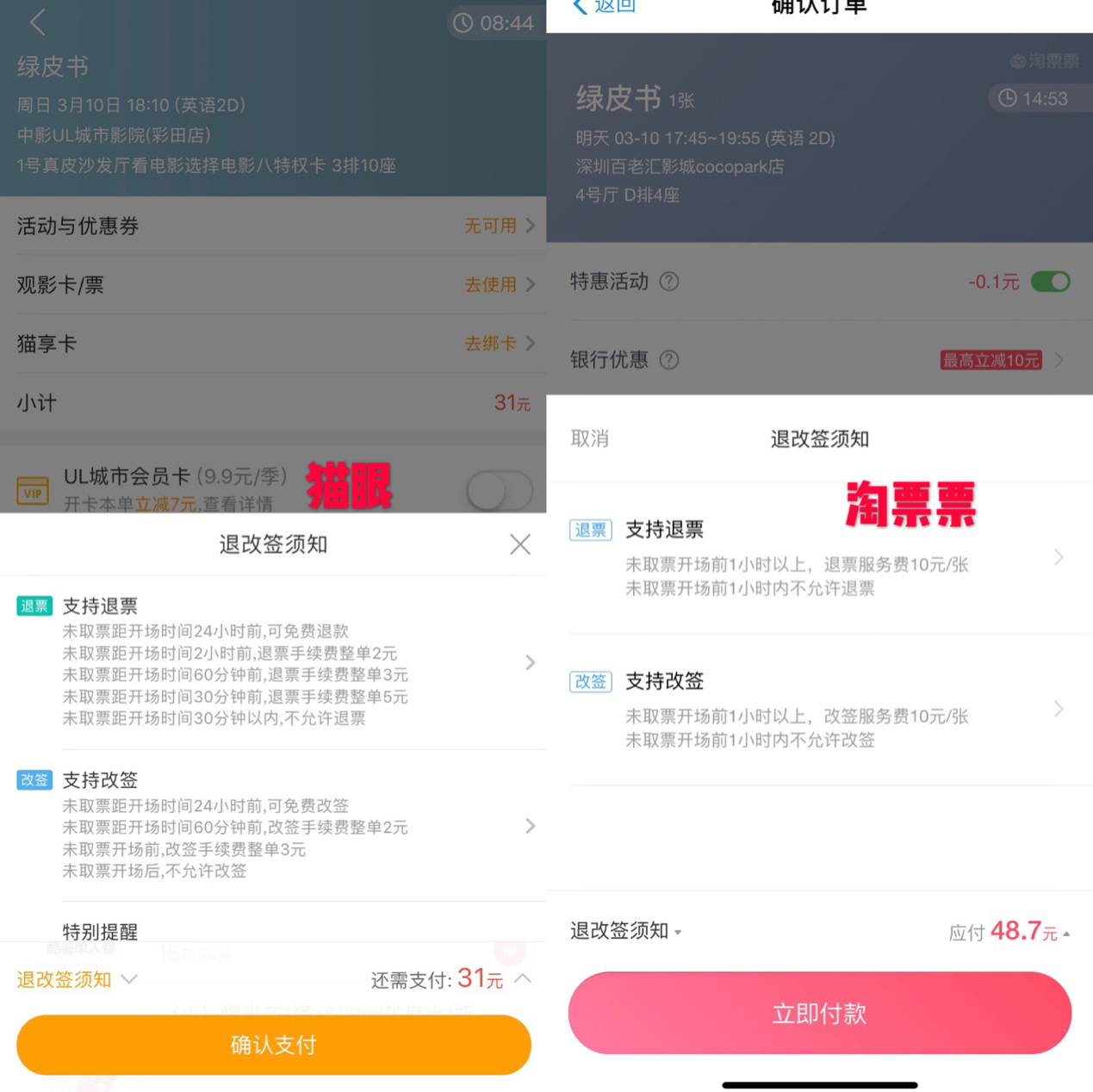 在淘票票APP上以及福田多家電影院,未取票開(kāi)場(chǎng)前1小時(shí)以上,退改簽服務(wù)費(fèi)10元/張,1小時(shí)以內(nèi)則不允許退改簽。使用電影兌換券、兌換碼、首映等特殊場(chǎng)次均不能辦理退改簽。