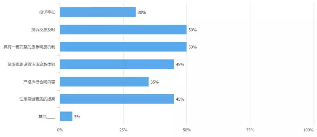 在眾多的旅游體驗(yàn)當(dāng)中,消費(fèi)者遇到的最主要的問題是強(qiáng)制購物、遭遇虛假宣傳、臨時(shí)更改旅游線路等問題,同時(shí)消費(fèi)者在選擇旅游線路時(shí),“野馬旅行社”、導(dǎo)游的服務(wù)態(tài)度、安全等問題也在重點(diǎn)考慮范圍內(nèi)。在改進(jìn)旅行社服務(wù)質(zhì)量方面,80%的消費(fèi)者認(rèn)為現(xiàn)狀需要政府和網(wǎng)絡(luò)共同關(guān)注,才能營造良好的旅游環(huán)境。旅行社對于投訴案例的反應(yīng)機(jī)制和反應(yīng)速度,之后也將成為消費(fèi)者在選擇旅行線路時(shí)的重要考量標(biāo)準(zhǔn)之一。