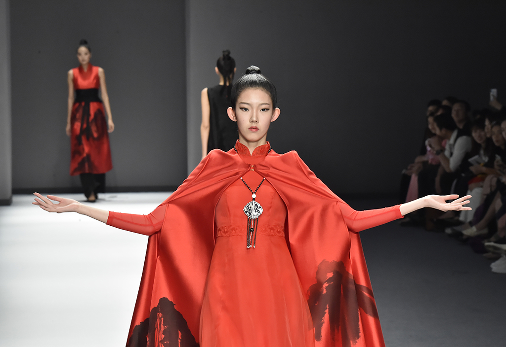 模特正在展示品牌Sunshine見花開的服裝 紅色的服裝盡顯東方美感