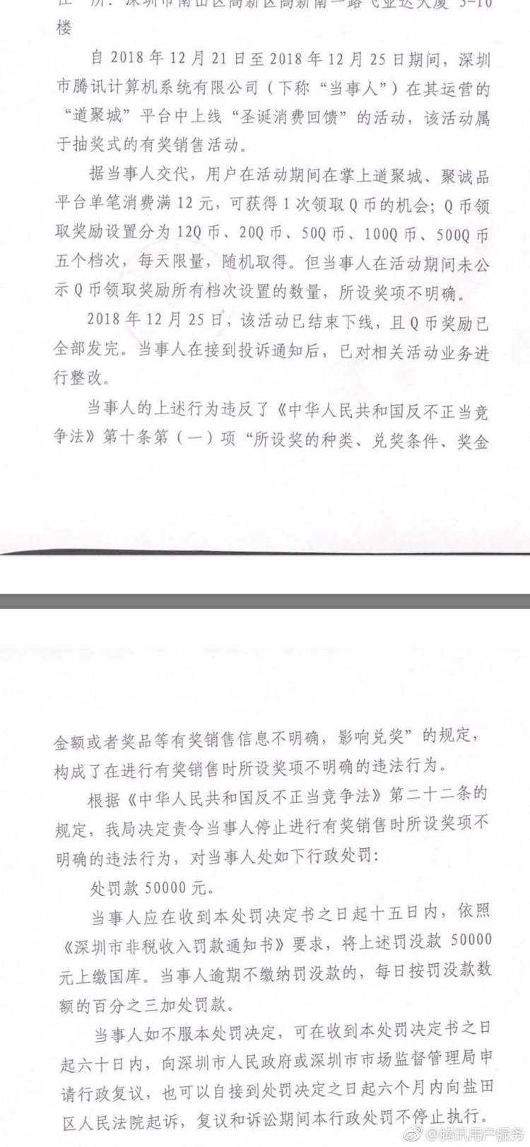 為解答網(wǎng)友疑惑,當(dāng)天晚間,微博賬號(hào)騰訊用戶服務(wù)公開發(fā)布了該處罰決定書,決定書中提到,2018年12月21日 -25日期間,深圳市騰訊計(jì)算機(jī)系統(tǒng)有限公司(下稱"當(dāng)事人")在其運(yùn)營(yíng)的"道聚城"平臺(tái)中上線"圣誕消費(fèi)回饋"的活動(dòng),該活動(dòng)屬于抽獎(jiǎng)式的有獎(jiǎng)銷售活動(dòng)。