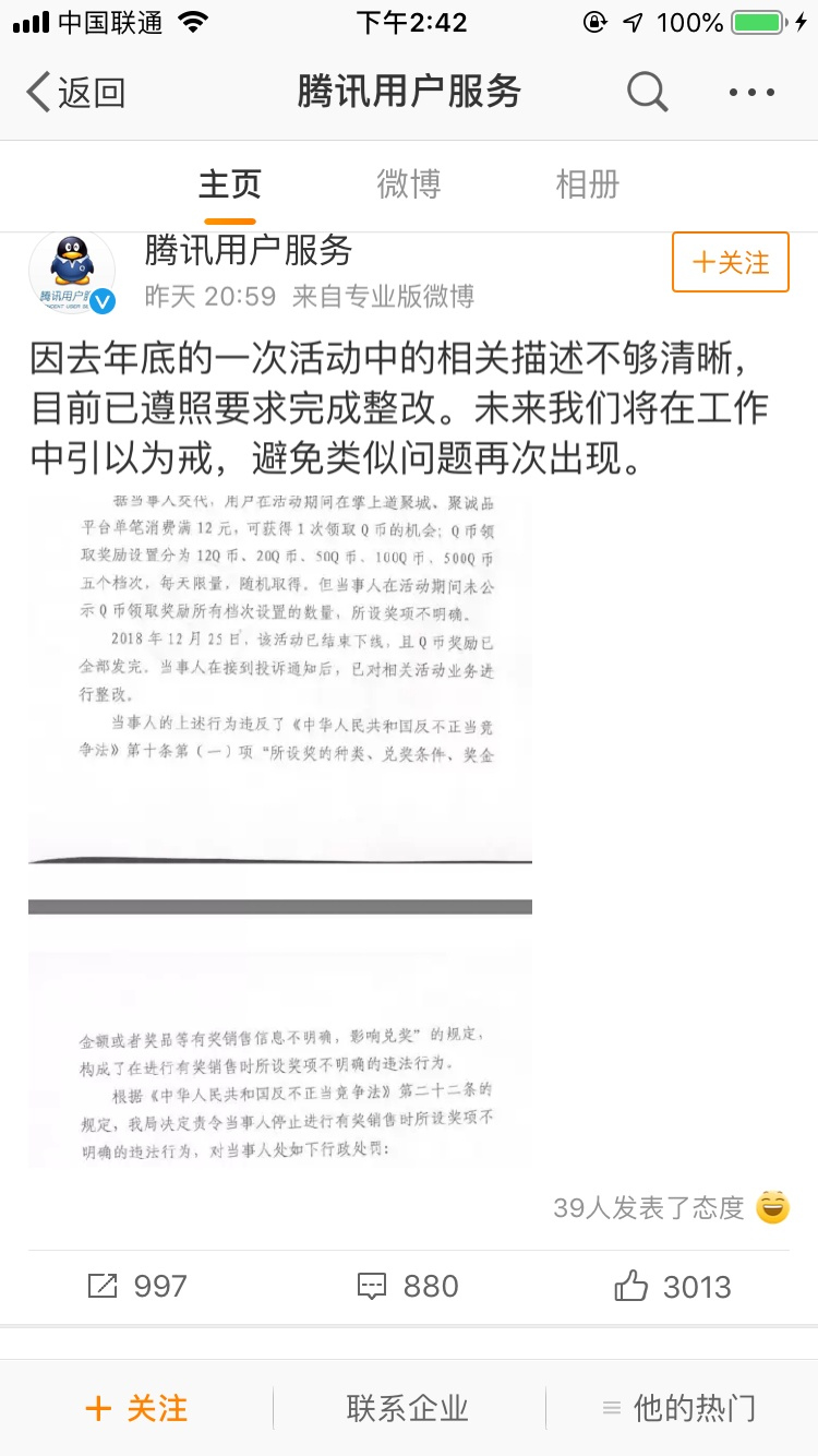 3月20日,微博認(rèn)證為騰訊公司公關(guān)總監(jiān)張軍在微博中解釋:因去年年底的一次活動(dòng)中的相關(guān)描述不夠清晰,目前已遵照要求完成整改。未來(lái)我們將在工作中引以為戒,避免類似問題再次出現(xiàn)。