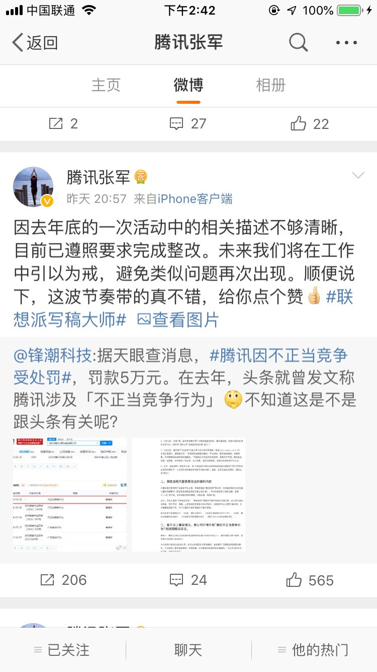 數(shù)據(jù)顯示,騰訊在前兩次受到行政處罰的類型均為不正當(dāng)競(jìng)爭(zhēng)。微博賬號(hào) @鋒潮科技發(fā)文稱,去年,今日頭條就曾發(fā)文稱騰訊設(shè)計(jì)不正當(dāng)競(jìng)爭(zhēng)行為,不知道這是不是跟頭條有關(guān)。對(duì)該揣測(cè),張軍還在微博中調(diào)侃工作人員不早公布緣由,導(dǎo)致該事件被人帶節(jié)奏。