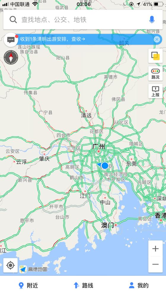 最后看看我們大廣東的路況,凌晨3點(diǎn)06分,廣州周邊明顯多了許多紅色“毛毛蟲”,每一條“毛毛蟲”的迷人紅色,想必都是各位司機(jī)大佬用車燈刷出來的!