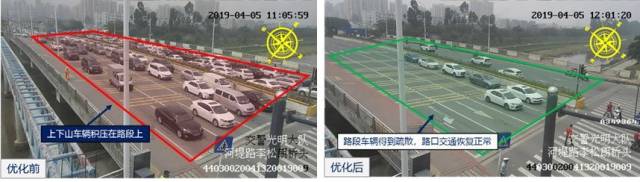 深圳交警立即使用臨時(shí)方案加大北面掉頭車(chē)輛放行時(shí)間,并啟用三條車(chē)道同時(shí)放行左轉(zhuǎn)與掉頭車(chē)輛,約15分鐘后路口排隊(duì)現(xiàn)象恢復(fù)正常。