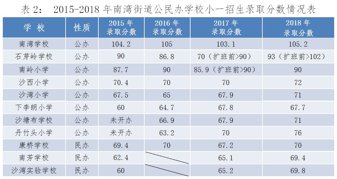 2015—2018年南灣街道公民辦學(xué)校小一招生錄取分?jǐn)?shù)情況表