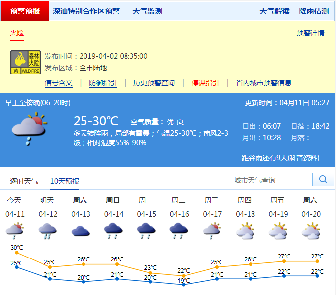 記者從深圳市氣象局了解到,11日深圳天氣多云轉(zhuǎn)陣雨;氣溫在25-30℃;南風(fēng)2-3級;相對濕度55%-90%。