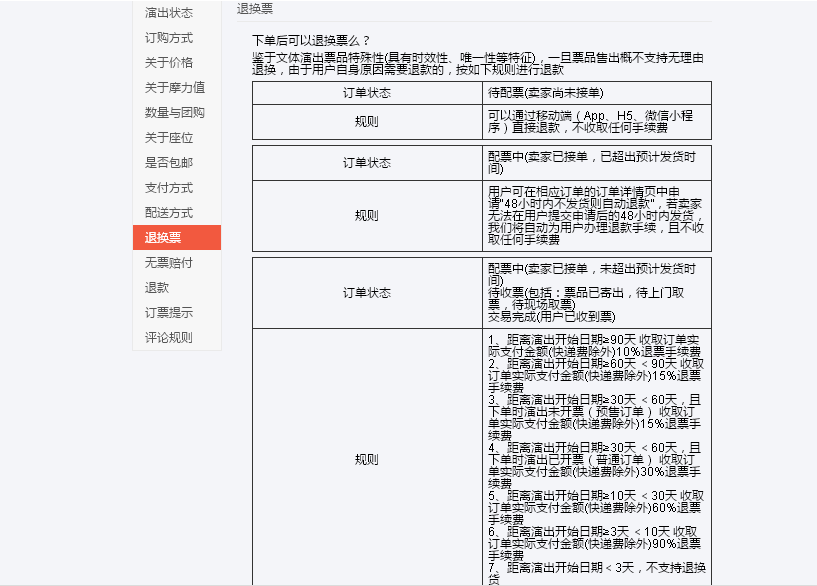記者隨后從該網(wǎng)站的“訂票提醒”中的退換票規(guī)則中看到,該網(wǎng)站的退換票手續(xù)費(fèi)實(shí)行“階梯費(fèi)率”,如距離演出開始日期90天或以上,要收取訂單實(shí)際支付金額(快遞費(fèi)除外)10%退票手續(xù)費(fèi);距離演出開始日期3天或以上但不超過(guò)10天,要收取訂單實(shí)際支付金額(快遞費(fèi)除外)90%退票手續(xù)費(fèi),距離演出開始日期3天以內(nèi),則不支持退換貨。
