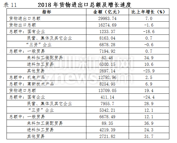 全年貨物進(jìn)出口總額29983.74億元,比上年增長7.0%。其中出口總額16274.69億元,下降1.6%;進(jìn)口總額13709.05億元,增長19.4%。出口總額連續(xù)二十六年居內(nèi)地大中城市首位。