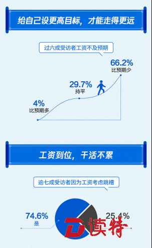 報(bào)告顯示,受經(jīng)濟(jì)環(huán)境等因素影響,過六成受訪者工資不及預(yù)期,同時(shí),工資水平影響了職場人的職業(yè)規(guī)劃,逾七成受訪者因?yàn)楣べY考慮跳槽;66.2%的受訪者工資水平比預(yù)期少,只有4%的受訪者認(rèn)為工資比預(yù)期多,此外,逾七成受訪者認(rèn)為工資是考慮跳槽的主要因素。
