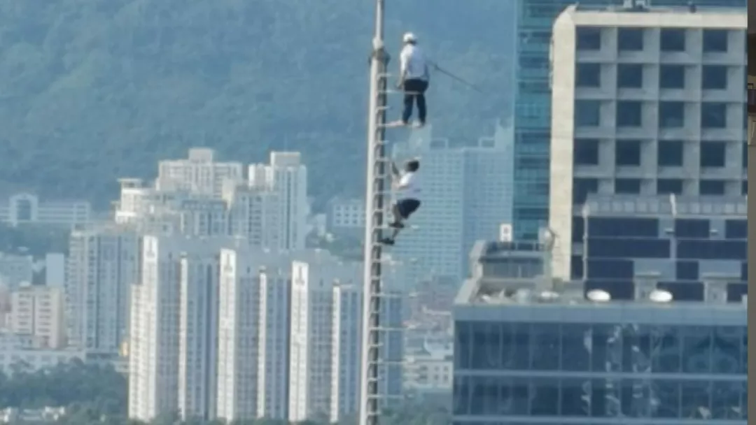 這段視頻拍攝于昨天上午9點左右,視頻拍攝者李先生表示,當時他正在公司值班,往窗外一看,卻發(fā)現(xiàn)對面的信息樞紐大廈塔頂,靠近中國電信招牌的位置有動靜,定睛一看,居然是兩個人在塔頂?shù)蔫F桿上游走。