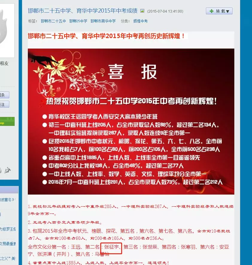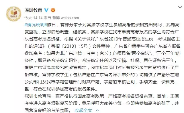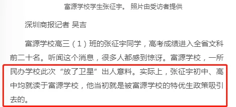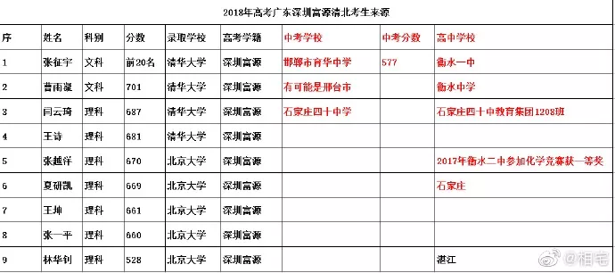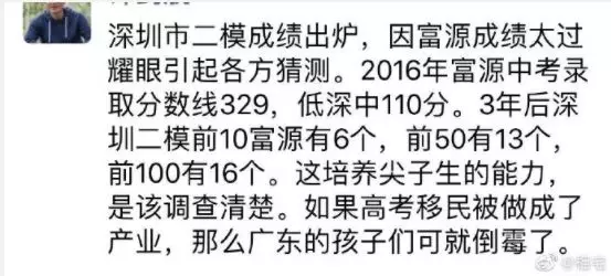 近日,深圳高三二模成績出爐,一所學校引起了深圳家長圈的高度關注。 有網(wǎng)友在微博上報料富源學校表現(xiàn)亮眼,一石激起千層浪,事件是怎么一回事呢?一起來看看 2019深二模各校尖子生成績 其中民辦學校寶安區(qū)富源學校異軍突起,尖子生占比遠超深圳最好的四大高中(深圳中學,深圳實驗中學,深圳外國語學校,深圳高級中學),引人注目。 網(wǎng)友議論紛紛 網(wǎng)友@相宅稱:深圳富源中學,18年考中清北的學生名單和初中來源統(tǒng)計,經過人肉搜索和大數(shù)據(jù)比對,確認相關證據(jù),有非常大的高考移民嫌疑。廣東高考本來就難,名校指標更少,還來擠占惹起公憤。同時附上19年深圳高考二模的富源成績。今年還有沒有高考移民,還會不會擠占廣東的名校指標? 針對網(wǎng)上的報料和家長的質疑,深圳教育局@深圳教育回應稱 情況說明 #情況說明#昨日,有部分家長對富源學校學生參加高考的資格提出疑問,我局高度重視,立即啟動調查。經核實,富源學校在我市申請高考報名的學生均符合廣東省高考報名資格。根據(jù)《關于做好廣東省2019年普通高校招生統(tǒng)一考試報名工作的通知》(粵招〔2018〕15號)文件精神,廣東省戶籍學生可在廣東省內報名參加高考;如果為非廣東戶籍,考生(家長)必須具備“兩個合法”、“三個三年”的條件,即具備合法穩(wěn)定職業(yè)、合法穩(wěn)定住所以及學籍、社保、居住證各滿三年。根據(jù)廣東省高考報名的政策規(guī)定,我市招考部門對所有報名考生的資格進行了嚴格審核。富源學校學生(包括戶籍在廣東省內深圳市外的)均提供了戶籍所在地公安部門及我市學籍管理部門對其戶籍、學籍的審核證明,手續(xù)齊全、資料完整,符合在深圳參加高考的報名條件。 深圳市教育局一直嚴格執(zhí)行國家高考政策,嚴格高考報名資格審查。目前,正值考生進入高考緊張復習階段,我局呼吁大家關心每一位即將參加高考的孩子,共同營造良好的考前氛圍。 回應之下,小編根據(jù)現(xiàn)有的資料,發(fā)現(xiàn)了這些信息出入,一起接著往下看! 對比:富源學校深圳一模成績 成績單顯示,在前十名單里,富源學校獨占6位,而深圳四大公辦重點高中總和也只有4位,這是什么情況?對照看一看一模成績: 三年來深圳中考錄取情況: 富源學??梢娚床徽純?yōu)勢 再來看一看三年來深圳中考錄取情況:富源學校可見生源并沒有什么優(yōu)勢,總分460分的錄取分數(shù)比四大重點低了將近100分,但也不能因此說明該學校沒有尖子生源。 2018年富源學校高考清北名單:9位同學上清北 下圖是2018年幾所大學在廣東(理科)招生計劃: 但是,這幾名考進清北的同學,名字竟然出現(xiàn)在兩所不同的高中??? 考進廣東前20名的張征宇同學 網(wǎng)友爆料稱,深圳富源中學2018年高考喜報,特別宣傳了張征宇同學(后成功考入清華大學)。而他也出現(xiàn)在2015年的邯鄲市育華中學中考喜報上。乾坤大挪移,坐地日行八萬里! 家長質疑:富源中學光榮榜的同學 怎么又出現(xiàn)在衡水中學喜報上? 針對上面9位同學,搜索信息顯示,竟然有五位同學來自有名的高考大省河北。 在2018年的第31和32屆化學奧林匹克競賽的名單上,有一個共同的名字:崔一龍,但他們來自不同的學校。高二時他在衡水第一中學,高三他出現(xiàn)在深圳富源中學。 同時,該網(wǎng)友還發(fā)了一封 #一位深圳中學生家長寫給教育部的控訴信# 尊敬的國家教育部領導: 您好! 我是深圳市一名中學生的家長。這幾日網(wǎng)上流傳出一份深圳市高三年級第二次模擬考試前幾名學校分布成績單,其中民辦學校寶安區(qū)富源學校異軍突起,遠超深圳最好的四大高中(深圳中學,深圳實驗中學,深圳外國語學校,深圳高級中學)引起廣大家長的關注。隨后網(wǎng)上流傳出是富源學校與河北衡水中學之間的高考移民消息,具體操作是通過將河北衡水中學的尖子生戶口轉移到深圳富源學校,平時在衡水中學上課,考試在深圳富源學校,并參加深圳市高考。此情況幾年前已有,數(shù)量沒有那么大。今年突然大量此類考生出現(xiàn),大家猜測,如果不加管控未來必將愈演愈烈。 作為一名普通深圳市民和學生家長,我守法遵紀,但是實在難以接受這樣的現(xiàn)實。希望教育部能夠徹查此事,查明真相,還廣大家長和考生一個公道。 記者調查 網(wǎng)上傳出深圳高三二模數(shù)據(jù)圖,記者向深圳某中學老師證實了該表格的真實性。從數(shù)據(jù)中可看到,深圳二模全市前十共有11名,其中富源6名,深圳中學3名,深圳實驗學校和市高級中學各占1名。有家長質疑這是富源學校從衡水中學引入了高考移民,才導致二模成績一下子拔尖,并已申請要求有關部門徹查。 同時,小編梳理去年的報道發(fā)現(xiàn),張征宇同學此前的采訪顯示:張征宇初中、高中均就讀于富源學校,他當初就是被富源學校的特優(yōu)生政策吸引去的。 但是記者調查發(fā)現(xiàn),張征宇同學的名字出現(xiàn)在邯鄲市2015年中考喜報上。 此外,網(wǎng)上現(xiàn)正流傳富源模式:一方面從衡水挖學生過來利用深圳入戶容易這一點搞成深戶,在深圳高考,另一方面招深圳的孩子,學籍掛在深圳,送去衡水上課,再回深圳高考。 【這四大謎團仍待解】 盡管教育部門通報稱,經核實,富源學校在深圳申請高考報名的學生均符合廣東省高考報名資格。但網(wǎng)