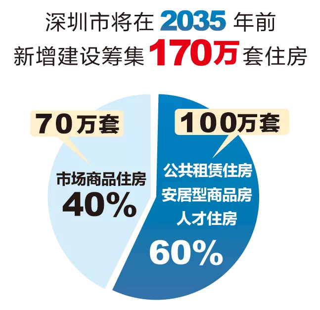 市住建局相關負責人介紹,2018年8月,市政府出臺了《關于深化住房制度改革加快建立多主體供給多渠道保障租購并舉的住房供應與保障體系的意見》(以下簡稱“主文件”)。新時代,深圳市將針對不同收入水平的居民和專業(yè)人才等各類群體,著力構建多層次、差異化、全覆蓋的住房供應與保障體系,努力實現(xiàn)全體市民住有所居?!爸魑募碧岢錾钲谑袑⒃?035年前新增建設籌集170萬套住房,其中:市場商品住房70萬套,占40%左右;公租房、安居型商品房和人才住房共100萬套,占60%左右。