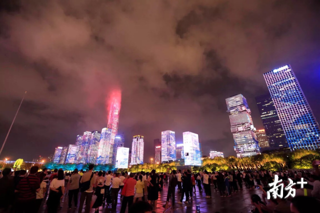 南方+客戶端2019年5月7日訊 5月1日18:40,剛剛來到深圳成為實(shí)習(xí)教師的趙同學(xué),早早在市民中心占了位置,她發(fā)了一條朋友圈:“等待市民中心燈光秀的人從眾……”50分鐘后,福田中心區(qū)的43棟樓宇閃爍起五彩斑斕的燈光,照亮了她疲憊卻興奮的臉。
