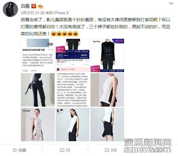 無(wú)獨(dú)有偶。5月5日,深圳影兒時(shí)尚集團(tuán)(以下簡(jiǎn)稱:影兒集團(tuán))正式向深圳市中級(jí)人民法院提起訴訟請(qǐng)求,就超模呂燕多次在微博上指責(zé)影兒集團(tuán)是“抄抄集團(tuán)”,造成影兒集團(tuán)重大名譽(yù)損失和巨額經(jīng)濟(jì)損失一事,起訴超模呂燕及其公司上海是你商貿(mào)有限公司不正當(dāng)競(jìng)爭(zhēng),要求兩被告立即停止侵權(quán)行為,賠償經(jīng)濟(jì)損失1000萬(wàn)元,并公開(kāi)道歉。