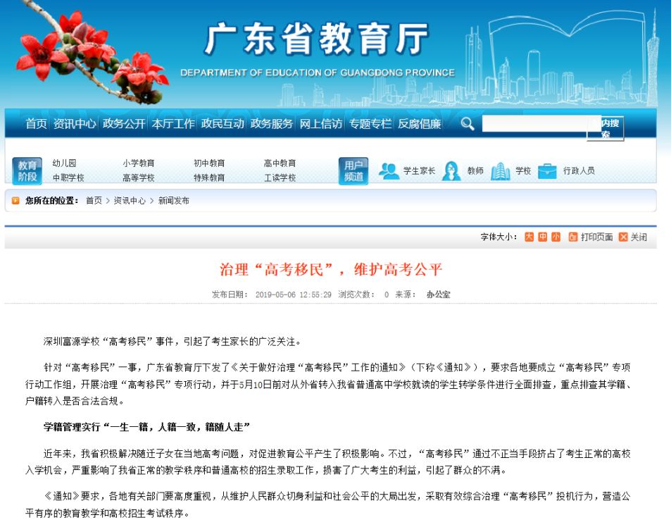 目前,深圳市已成立專項工作小組進(jìn)行調(diào)查。廣東省教育廳廳長景李虎昨天表態(tài),將在10號前對外省轉(zhuǎn)入生轉(zhuǎn)學(xué)條件進(jìn)行排查,并公布舉報郵箱,對“事情進(jìn)行徹底的整理”,明確:“一旦發(fā)現(xiàn)高考移民將安排回原籍高考,高考后發(fā)現(xiàn)高考移民將取消高考成績”。