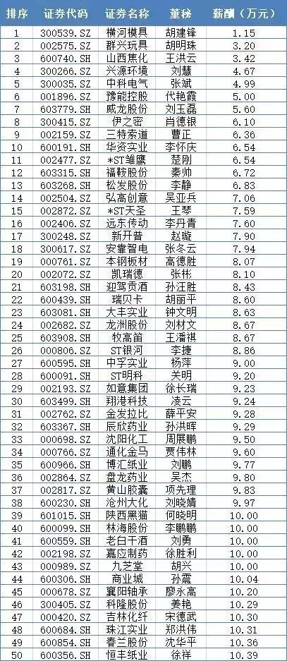 值得注意的是,有73位董事長年薪低于10萬元,有6位甚至低于1萬元。最低的是金宇車城匡志偉2500元。